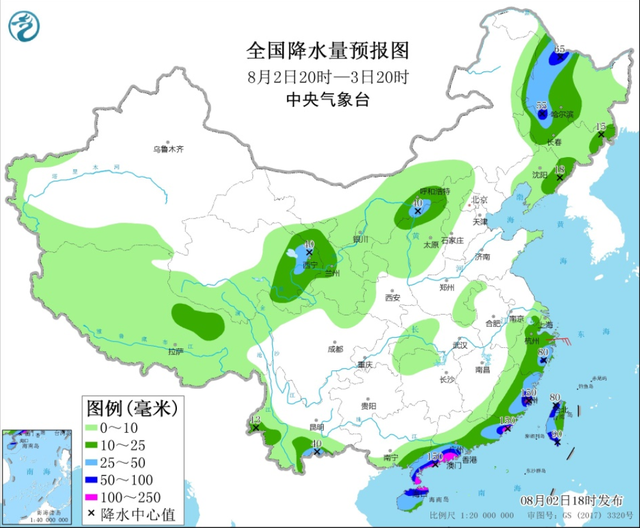 8月2日20时至3日20时,江南东部、华南南部、东北地区西部、青海东部、内蒙古中部偏南地区、陕西北部、海南岛、台湾岛等地的部分地区有中到大雨,其中,黑龙江西部、吉林西北部、福建东南部、广东东部和西南部沿海、海南岛北部、台湾岛北部和南部等地的部分地区有暴雨或大暴雨(100~150毫米)。