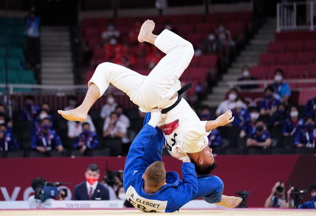 新华社照片,东京,2021年7月31日 (东京奥运会)(7)柔道——法国队获得混合团体赛冠军 7月31日,法国队选手克莱热(上)在男子90公斤以下级比赛中战胜日本队选手向翔一郎。 当日,在东京奥运会柔道混合团体赛中,法国队战胜日本队,获得冠军。 新华社记者 刘大伟 摄
