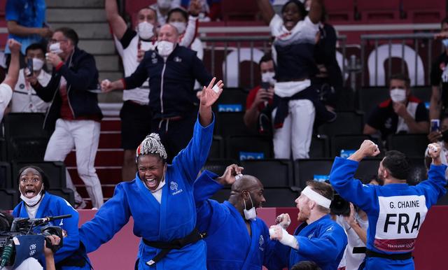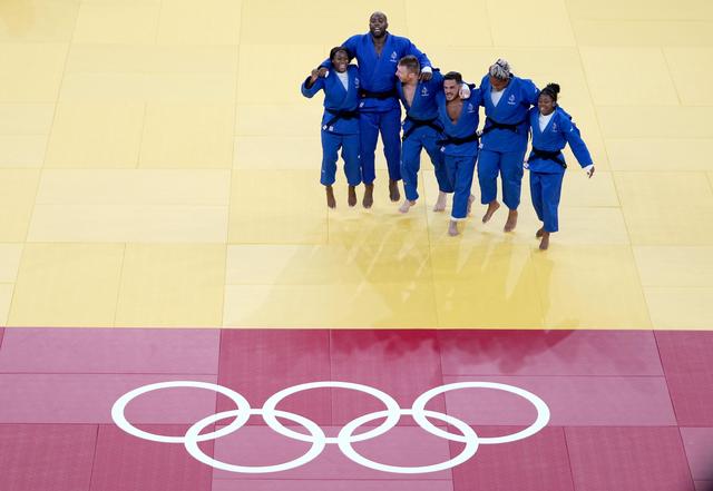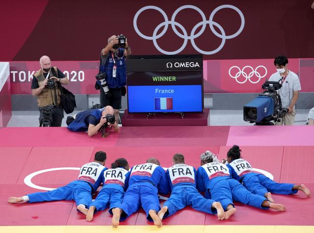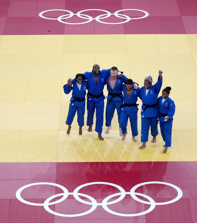 新华社照片,东京,2021年7月31日 (东京奥运会)(4)柔道——法国队获得混合团体赛冠军 7月31日,法国队队员庆祝胜利。 当日,在东京奥运会柔道混合团体赛中,法国队战胜日本队,获得冠军。 新华社记者 王毓国 摄