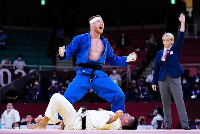 新华社照片,东京,2021年7月31日 (东京奥运会)(1)柔道——法国队获得混合团体赛冠军 7月31日,法国队队员庆祝胜利。 当日,在东京奥运会柔道混合团体赛中,法国队战胜日本队,获得冠军。 新华社记者 刘大伟 摄