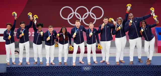新华社照片,东京,2021年7月31日 (东京奥运会)(9)柔道——法国队获得混合团体赛冠军 7月31日,法国队队员颁奖仪式上庆祝。 当日,在东京奥运会柔道混合团体赛中,法国队战胜日本队,获得冠军。 新华社记者 王毓国 摄