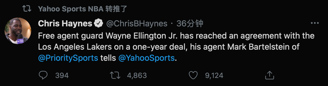 据Yahoo记者Chris Haynes报道,湖人和活塞后卫韦恩-艾灵顿达成协议,后者将以一年合同加盟。即将年满33岁的艾灵顿在上赛季效力活塞期间,场均出场22分钟,可以得到9.6分1.8篮板,每场可以投进2.5记三分,三分命中率达到了42.2%,是一名不俗的射手。他曾有过单场命中8记三分的高光时刻,对于外线火力薄弱的湖人而言是一个不错的补充。艾灵顿曾在14-15赛季效力于湖人。