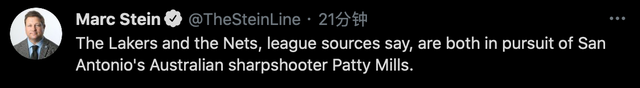 除了这三名球员以外,湖人下一个引援目标也正式曝光,据记者Marc Stein的报道,他们的目标锁定了马刺后卫帕蒂-米尔斯。即将年满33岁的米尔斯上赛季场均得到了10.8分2.4助攻,每场可以投进2.4记三分,三分命中率达到了37.5%。他对于外线的威胁,是湖人急需补充的球员类型。目前米尔斯正在随着澳大利亚征战2020东京奥运会,可能需要比赛结束后才有签约动向。湖人目前最大的竞争者是篮网,他们同样对于这名老将非常感兴趣。