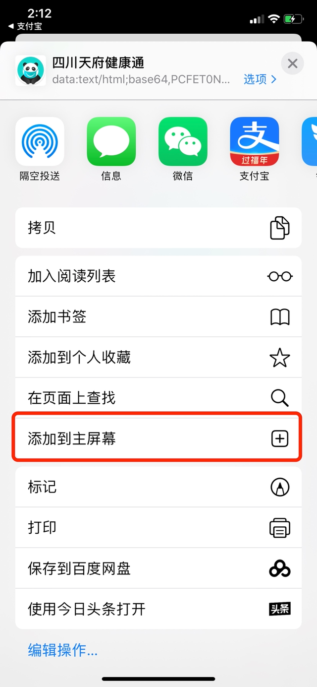 苹果手机设置方法:支付宝打开“四川天府健康通”小程序,点击右上角的“…”图标,点击“添加到桌面”。