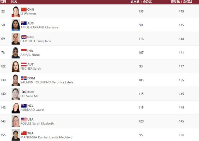 李雯雯的抓举开把重量是135kg,挺举开把重量是175kg。李雯雯的优势有多大呢?李雯雯的抓举开把重量甚至已经超过了很多选手的挺举开把重量。领先的优势太大了,从开把重量就能看出李雯雯无敌的信心。