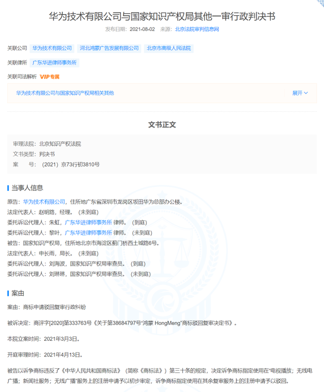 集微网消息,天眼查App显示,8月2日,华为技术有限公司与国家知识产权局其他一审行政判决书公开,案号(2021)京73行初3810号,审理法院为北京知识产权法院。