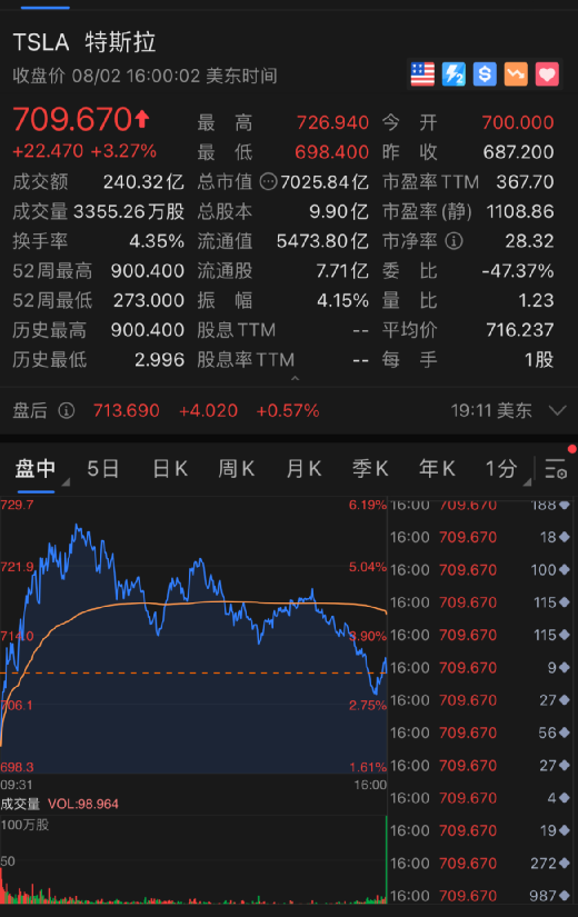 国产车企的亮眼交付数据提振行业信心,市场预期特斯拉7月在中国的销量将表现出色,特斯拉周一也上涨,收盘涨超3%,市值大涨222.47亿美元,约合1437亿人民币。