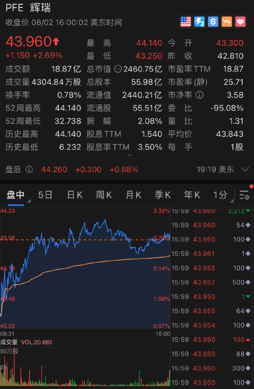 美东时间周一,辉瑞股价上涨2.69%,市值大涨64.46亿美元,约合416亿人民币。