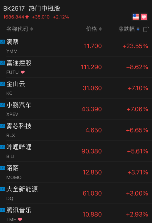 而热门中概股整体跑赢大盘,满帮大涨23.55%,富途和老虎均涨超8%。