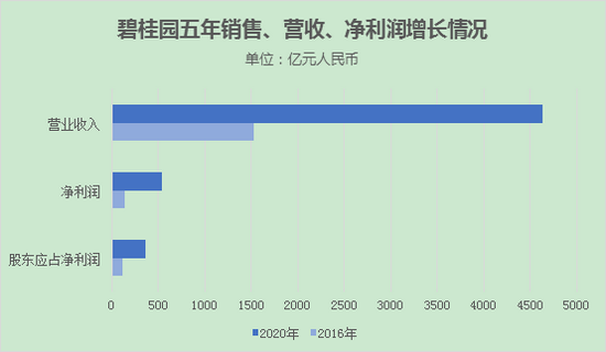 把时间放长一点来看,碧桂园持续稳健增长的态势更加清晰。2016年至2020年期间,碧桂园权益合同销售金额复合增长率高达25%,同时其他各项核心盈利指标均大幅增长。五年间,碧桂园营收从1530.9亿元增长至4629亿元,涨幅达202.4%;净利润从136.6亿元增长至541亿元,涨幅达296%;股东应占净利润从115.16亿元增长至360.2亿元,涨幅达212.8%。
