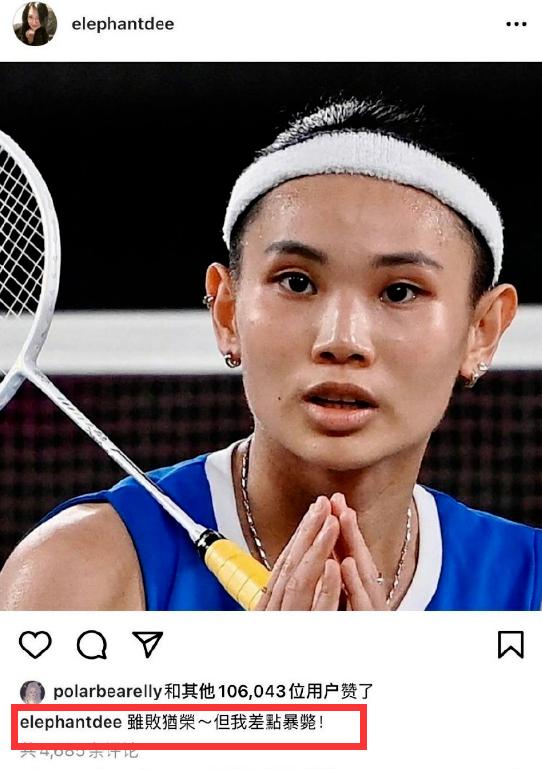 8月1日,女单羽毛球比赛时,小S就忍不住口嗨在外网频繁发布动态,盛赞戴资颖选手是“虽败犹荣,但我差点暴毙”,当时就有不少网友质疑小S的用词不当,疯狂嘲讽小S的用词!