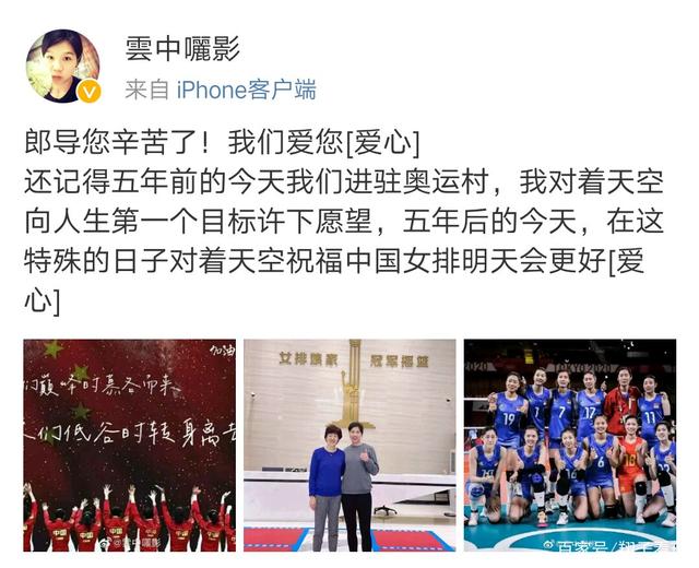 在郎平发表告别演说后,中国女排里约奥运会冠军成员、参加过三届奥运会的徐云丽,也是在第一时间向郎平表示敬意,她表示,“郎导您辛苦了!我们爱您!还记得五年前的今天我们进驻奥运村,我对着天空向人生第一个目标许下愿望,五年后的今天,在这特殊的日子对着天空祝福中国女排明天会更好!”