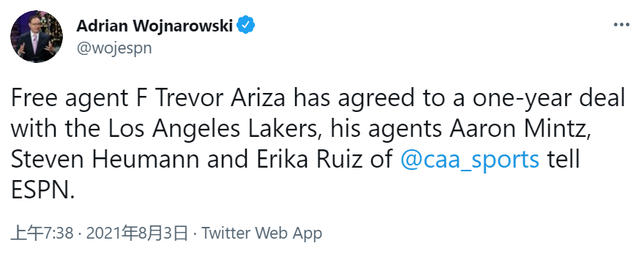 首先是根据ESPN名记Woj报道,湖人与旧将特雷沃-阿里扎签下一年合同。