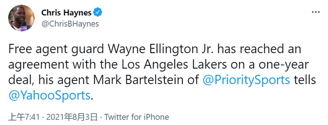 接着名记海恩斯跟进报道,韦恩-艾灵顿以一年合同加盟湖人,他曾在2014-15赛季为湖人效力一年。