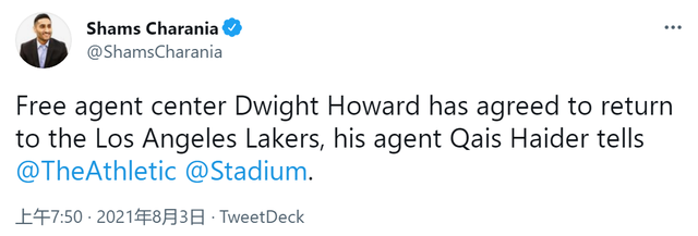 接着名记Shams报曝出,在连签两人之后,湖人队又带回第三名旧将霍华德。