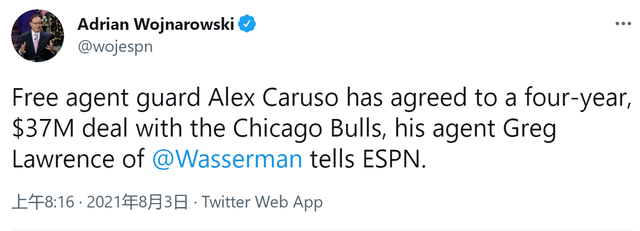 根据名记Woj报道,卡鲁索已经被公牛挖角,双方完成了一份4年价值3700万美元的合同。