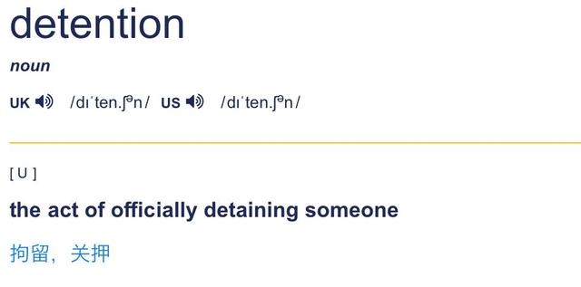 detention 的意思就是“拘留,关押,羁押”。青少年犯罪后被关押管教的那种少管所就可以说detention center,同时,这个词组还可以特指拘留非法移民者的那种拘留所。 detention还有一个用法值得注意,除了“拘留”,它还有“放学后被惩罚留校”的意思,你们在上学的时候,有没有detention的经历呢? ·举个例子· She's had four detentions this term. 这学期她4次被罚课后留下。