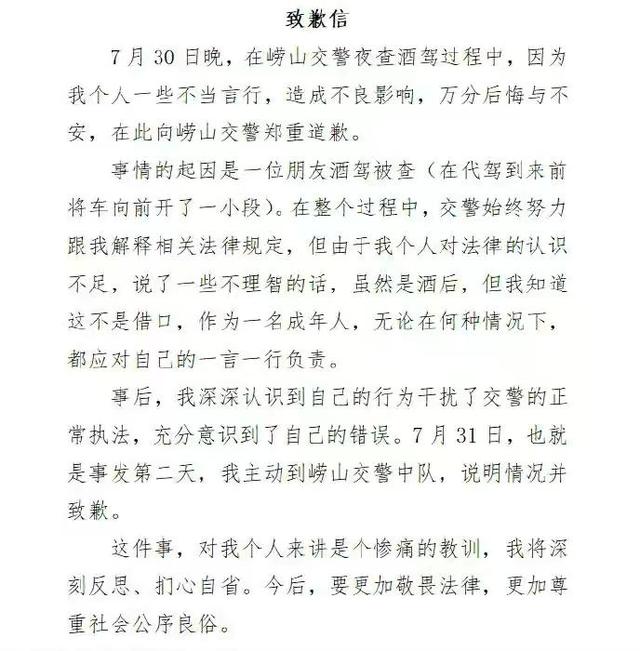 八月一日,赵强在微博上发表了道歉声明,说酒后驾驶的并非自己,因为晚上喝酒,说话不够理性,妨碍交警执法,这一点让交警感到非常抱歉。