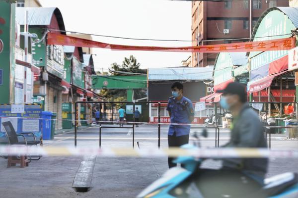 位于长江路上的高砦农贸市场,市场完全关闭,两位城管的工作人员正在门口值守