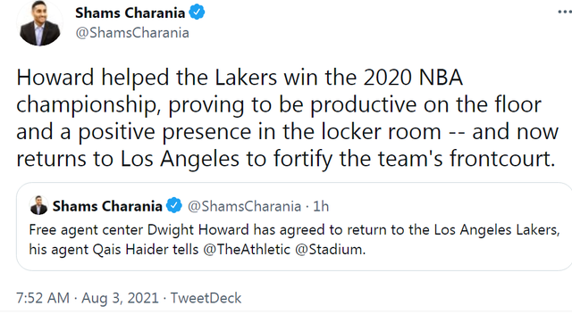 根据NBA著名记者Shams报道,消息人士透露,中锋德怀特霍华德重回湖人。