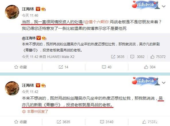 8月2日,知名编剧汪海林突然爆料,称《青簪行》的投资人其实就是肖战老板。据他所言,他自己本来也不想说的,但是肖战粉丝蹭吴亦凡热度的同时一直在拉扯他,所以才不得已而为之。先前汪海林曾表示自己和肖战老板是朋友,而这次爆料,他表示自己仍然很同情对方。