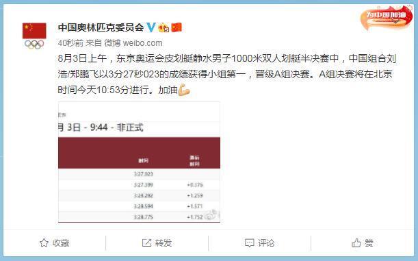 中工网讯 据中国奥林匹克委员会官微消息,8月3日上午,东京奥运会皮划艇静水男子1000米双人划艇半决赛中,中国组合刘浩/郑鹏飞以3分27秒023的成绩获得小组第一,晋级A组决赛。A组决赛将在北京时间今天10:53分进行。