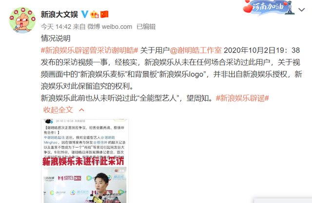 当然,在吴亦凡事件闹得沸沸扬扬之际,另一个蹭热度之王谢明皓也开始重拳出击,他发出微博实名举报林俊杰、潘玮柏参与吴亦凡的有关事件之中,这无疑又捅开了一道口子,让林俊杰、潘玮柏也陷入了争议之中,不过,很快双方纷纷辟谣,对于谢明皓方来说也是被平台辟谣,又被湖南卫视辟谣,因为谢明皓公然造谣自己接受媒体采访,还参加过湖南卫视跨年演唱会,早先谢明皓更是不断造谣肖战、王一博的有关黑料,还自称和蔡徐坤、王俊凯认识,不过都一一被戳穿了谎言,一切都是自导自演。