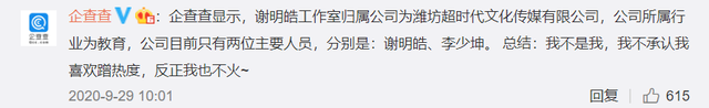 之前,更是被企查查揭露真相直接说道“谢明皓工作室归属公司为潍坊超时代文化传媒有限公司,公司所属行业为教育,公司目前只有两位主要人员,分别是:谢明皓、李少坤。 总结:我不是我,我不承认我喜欢蹭热度,反正我也不火~”