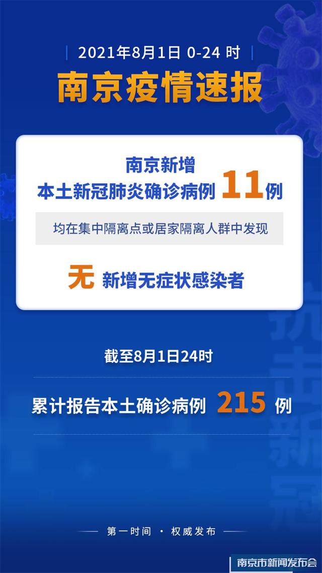 南京市卫健委副主任杨大锁:2021年8月1日0-24时,我市新增本土新冠肺炎确诊病例11例(均在集中隔离点或者居家隔离人群中发现),没有新增的无症状感染者。截至8月1日24时,全市累计报告本土确诊病例215例(其中81例为轻型,127例为普通型,7例为重型)。在这215例感染者中,江宁184例、溧水12例,建邺区、鼓楼区、雨花台区各4例、秦淮区3例、高淳区2例,玄武区、栖霞区各1例。经疫情防控专家组评估,我市今日无新增疫情中高风险区。通过对病例流行病学调查,排查出的相关密切接触者和次密接已按照有关规定进行甄别管理。新增确诊病例的相关情况会继续通过“南京发布”“健康南京”等微信公众号和微博公布。