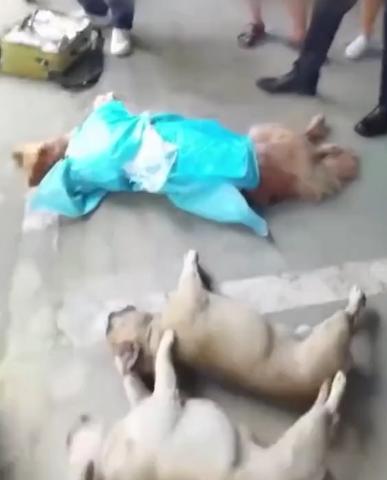8月2日,据其中一位狗主人回忆说,早上去遛狗,自家狗好像吃了地上的鸭骨头,之后回来就不对劲了,侧躺在地上,嘴里不停地往外吐白沫子,四肢僵直,身子使劲的摇晃,短短2分钟内,它就再也不动弹了。