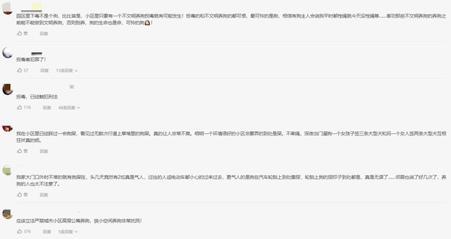 也有网友称:这肯定是该小区狗主人不文明遛狗,引起了小区其他住户的嫉恨,但是人的错为什么要狗去承担啊?假如这些毒药被小朋友误食了怎么办?冤冤相报何时了。