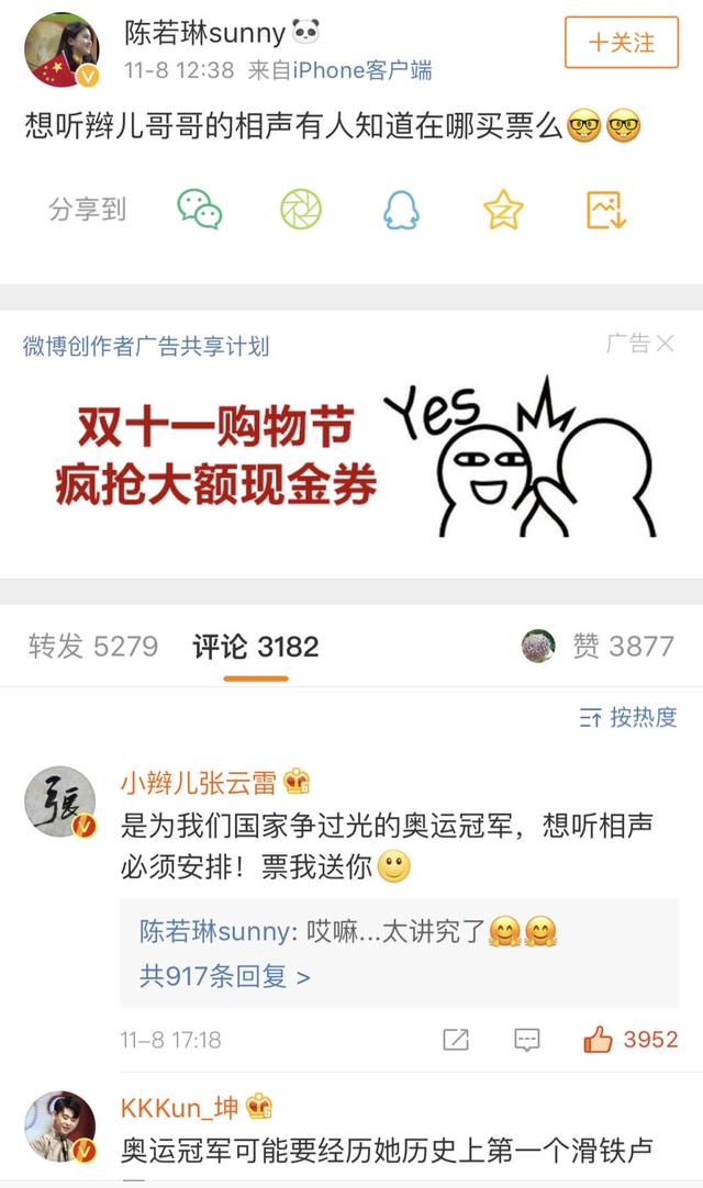 奥运冠军陈若琳曾经也说她想听辫儿哥哥的相声,询问网友,要去哪里买票?