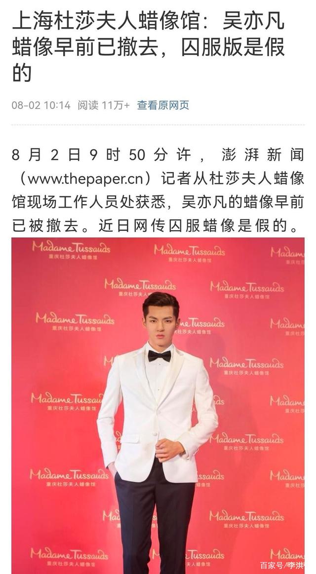 8月1日,有网友爆料称,自己去了上海的杜莎夫人蜡像馆,里面的吴亦凡蜡像还没有被撤掉,但被穿上了一件囚服,该网友还晒出照片以证真实。