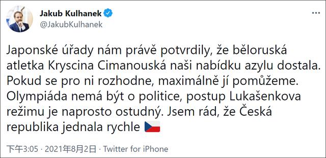 除了波兰,捷克也向这名运动员伸出援手。当地时间8月2日,捷克外交部部长雅各布·库尔哈内克(Jakub Kulhánek)发推表示,齐马努斯卡娅已收到捷克的庇护提议,捷克方面将尽可能地提供帮助。
