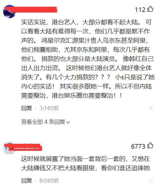 有网友就说,小S是当面一套背后一套的,又想在大陆赚钱又不把内地看在眼里。