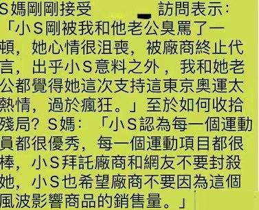 事件之后小s的母亲发文回应称“小s刚被我和他老公臭骂了一顿,被厂商终止代言,出乎小s意料之外”。