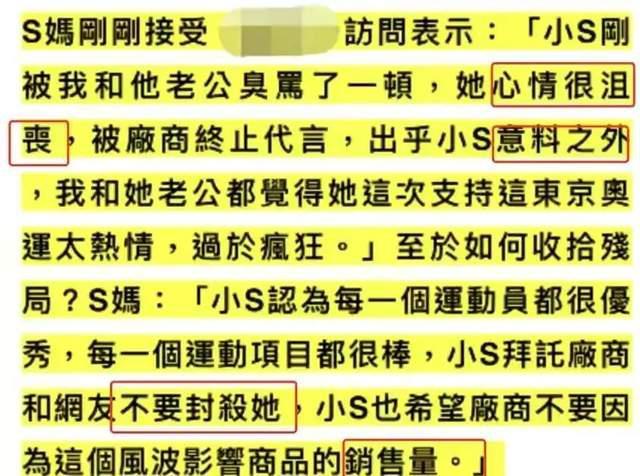 S妈妈在回应中还提到她和小S的老公都对小S臭骂了一顿,觉得她这次对于奥运会热情太过于疯狂了。