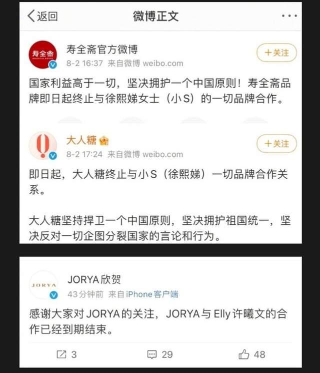 随着评论区的画风不断变化,小S才意识到事件的不妙,才删除了这条言论,但她的删除并没有阻止事件的发酵,随后与之合作的众多品牌纷纷与其解约。