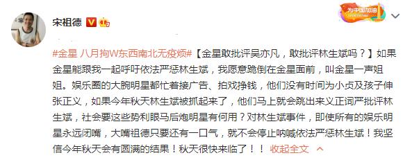 结语:宋祖德如此坚定的认为林生斌事件会在今年秋天有结果,我们也要相信宋祖德耗费这么长时间,肯定能将林生斌送进去。金星和宋祖德如果联手的话,这件事就容易很多了,毕竟明星的人脉更加广泛,大家认为呢?欢迎在评论区留言。