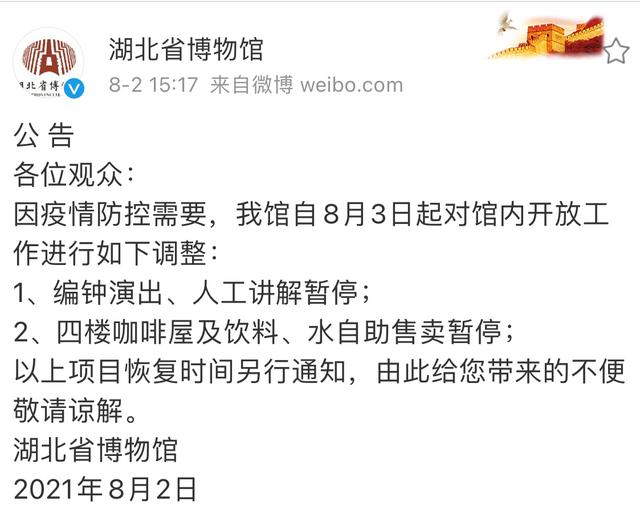 8月2日中午,湖北省图书馆发出关于暂停近期所有线下活动的通知,为控制和降低疫情传播风险,该馆自8月2日起暂停举办各类线下活动,恢复时间另行通知。
