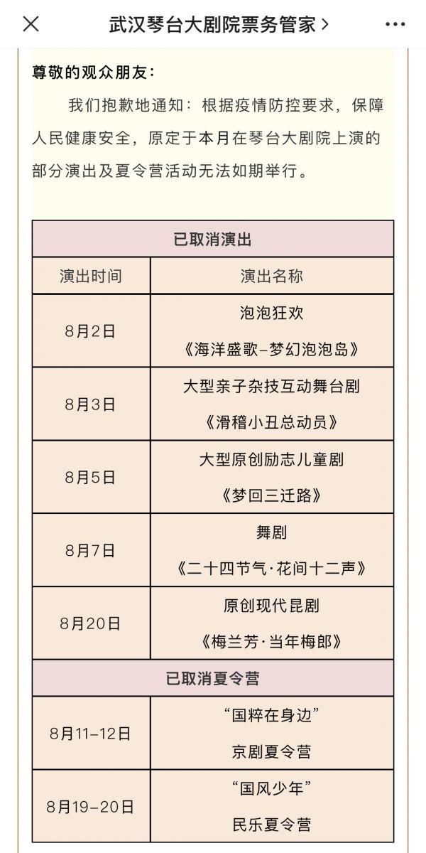 琴台大剧院公布原定于本月在琴台大剧院上演的部分演出及夏令营活动已取消。退票方式