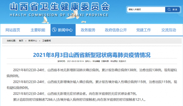 2021年8月2日0-24时,山西省本地无新增新冠肺炎确诊病例。累计报告确诊病例138例,治愈出院138例。现有疑似病例0例。