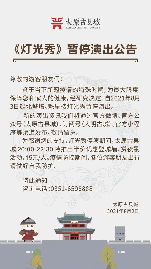 另外,太原古县城通知,暂停北城墙、魁星楼“灯光秀”