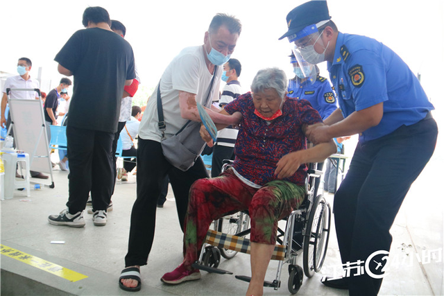 7月25日,在南京市金陵中学岱山分校东校区,雨花城管执法人员重点关注行动不便的老人,为他们核酸检测提供服务保障。