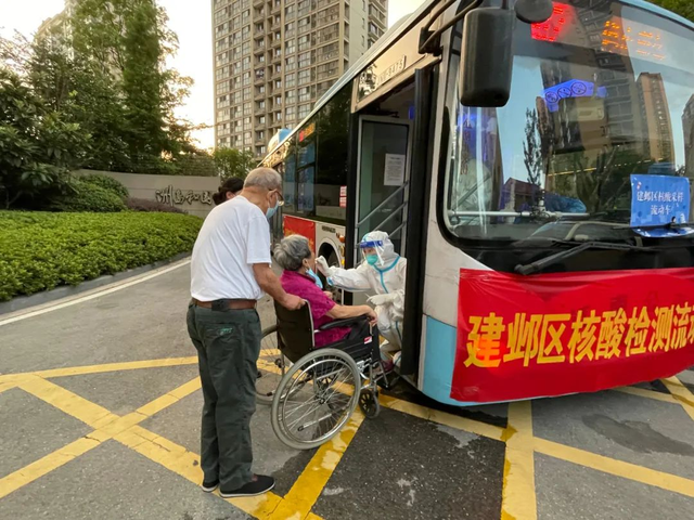8月1日,在南京建邺区,一百辆“核酸检测流动车”分赴各街道社区,对行动不便的老人和未能及时赶往第三次检测点的人员进行上门采样。