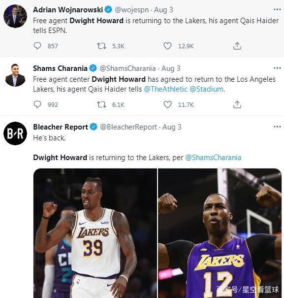 自由球员德怀特-霍华德愿意重回湖人,霍华德的经纪人盖斯-海德告诉霍华德已经准备和湖人签一份合同,霍华德将会成为他生涯第三次加盟洛杉矶湖人队。
