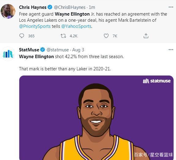 还有克里斯-海恩斯的报道称,自由球员艾灵顿愿意与湖人队续约一年,20-21赛季艾灵顿的三分球命中率高达42.2%,场均命中2.5个三分球,本赛季他是效力底特律活塞队的,他是活塞最神准的球员。