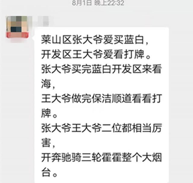 消息传出后,不少当地网友留言“两个大爷霍霍(祸害)了整个烟台”,甚至有人在网上对他们展开谩骂。更有好事者专门编排了有关两个大爷的段子,在朋友圈广为流传。