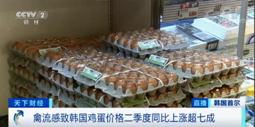 韩国另一种常见食品鸡蛋,受到禽流感的影响,价格同样居高不下。根据7月30日公布的数据,第二季度韩国蛋鸡数量同比减少超一成,约900万只。鸡蛋价格同比上涨七成多,成为同期涨幅最大的生活必需品。部分大型超市实行起鸡蛋限购,韩国表示将继续在本月内进口1亿枚鸡蛋。