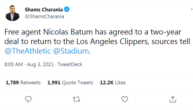 同为西部顶级豪强的快船队,也有签约消息传出。根据Shams报道,消息人士透露,快船已经和尼古拉斯巴图姆签下一份两年续约合同,但续约金额暂未透露,其中第二年是球员选项。